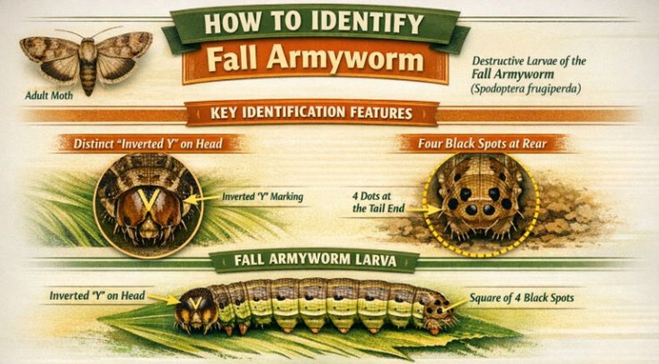 Graphic showing two of the key identifying features, the Y shape on head and 4 dots at the rear of Fall Armyworm